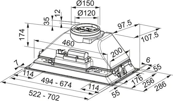 - Średnica wylotu powietrza: Ø 120 / 150 mm