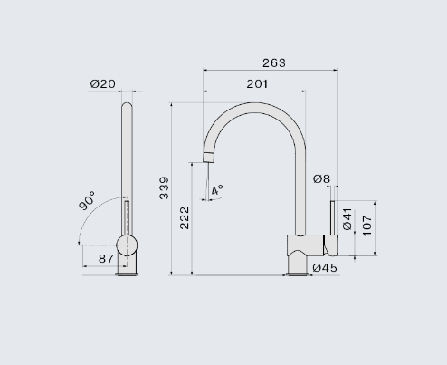- Wymiary: Single-lever sink mixer with tubular swivel spout 3/8” female connection hoses cm