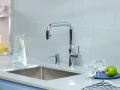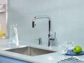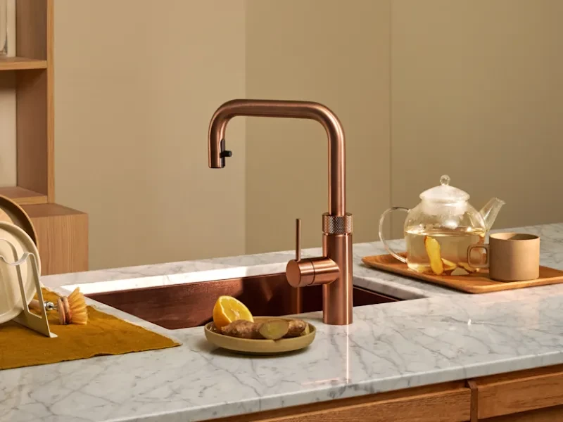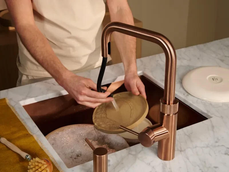 Quooker Flex posiada wyciąganą wylewkę, która zapewnia większy zasięg podczas płukania, czyszczenia i napełniania garnków. Oferuje wrzącą, ciepłą i zimną wodę, a z CUBE (urządzenie do kupienia osobno) także wodę filtrowaną schłodzoną i gazowaną — wszystko z jednego eleganckiego kranu. Wyciągana wylewka nigdy nie podaje wrzątku, co gwarantuje pełne bezpieczeństwo.