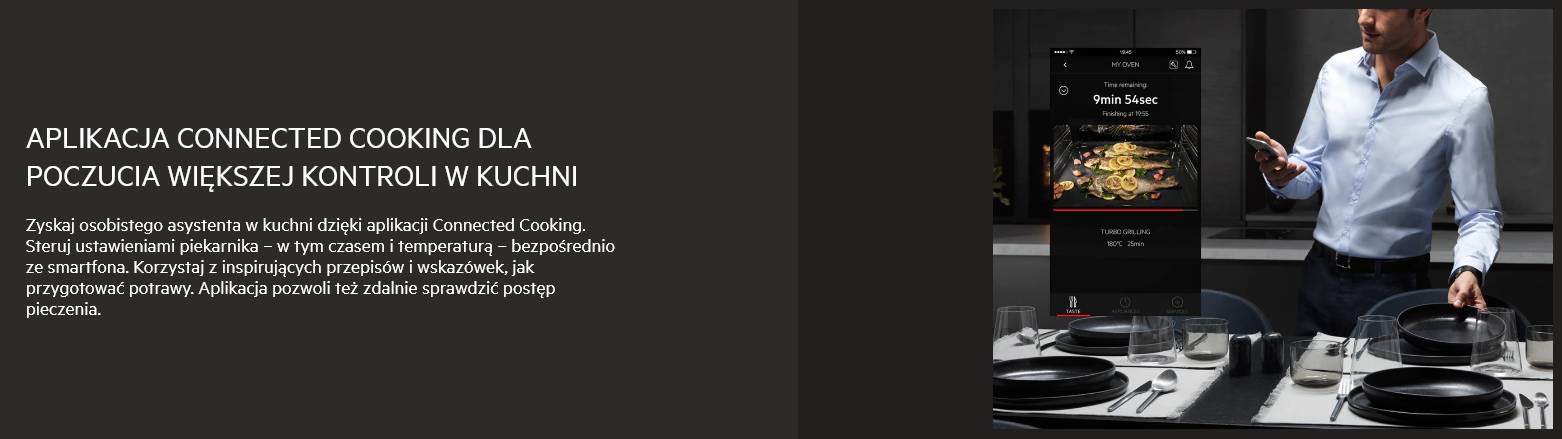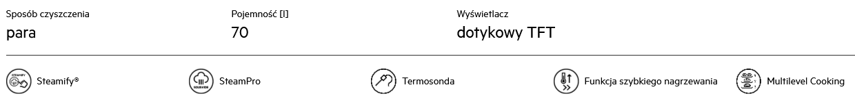 - Funkcje: Au Gratin, grzanie dolne, pieczenie chleba, konwencjonalne/tradycyjne pieczenie, rozmrażanie, wyrastanie ciasta, suszenie, zamrożone potrawy, para 100%, grill, duża wilgotność, mała wilgotność, średnia wilgotność, utrzymywanie ciepła, nawilżanie, pizza, ogrzewanie talerzy, utrzymywanie temperatury, powolne gotowanie, SousVide, regeneracja parowa , Steamify, termoobieg, grillowanie turbo, funkcja Yoghurt
