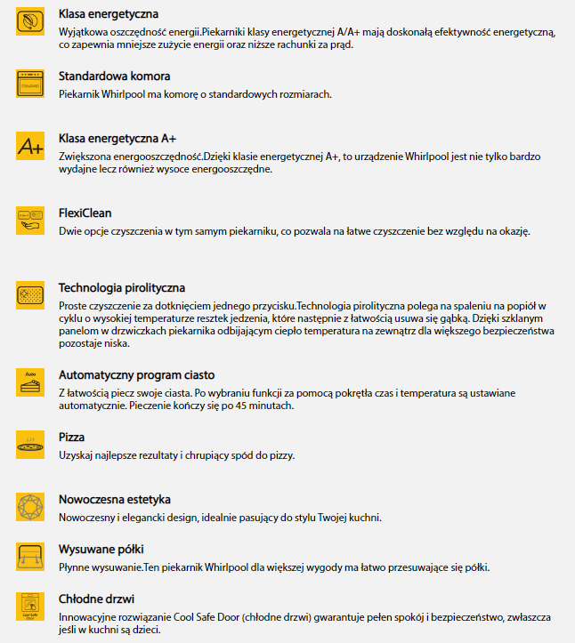 Cechy piekarnika do zabudowy Whirlpool: zaawansowana technologia elektryczna umożliwia oszczędne gotowanie potraw. Innowacyjna funkcja Cook3 umożliwia gotowanie trzech oddzielnych potraw jednocześnie bez ryzyka pomieszania zapachów. Delikatne zamykanie drzwiczek piekarnika ułatwiające korzystanie.