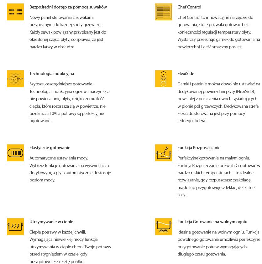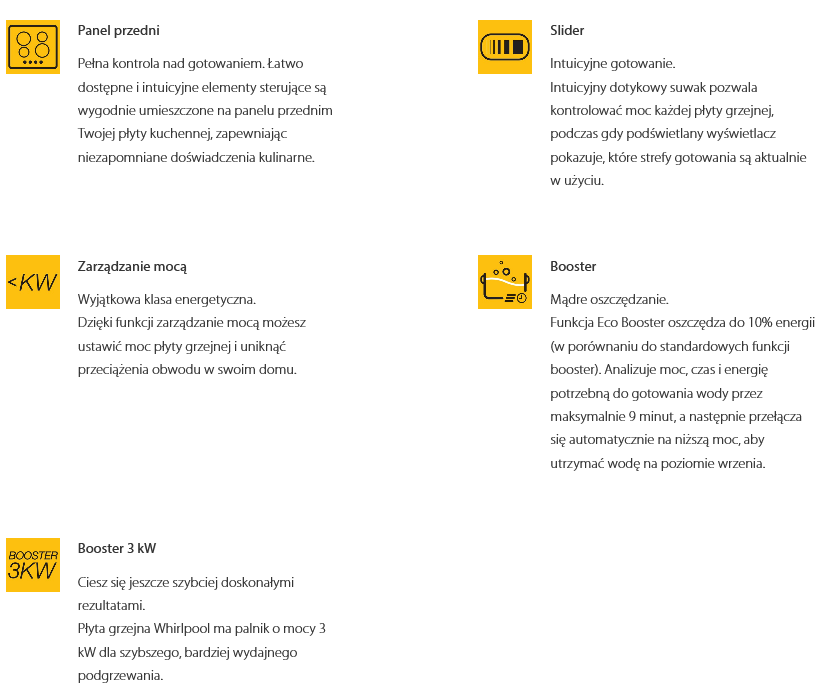4 pola grzewcze. technologia stref FlexiCook umożliwia połączenie kilku palników w jedną strefę grzewczą do gotowania i smażenia w większym naczyniu. Intuicyjne pokrętło do łatwego wprowadzania ustawień. Cechy płyty indukcyjnej szklano-ceramicznej Whirlpool: Wspaniała technologia, podgrzewająca patelnię a nie płytę, zmniejsza rozpraszanie energii i zapewnia doskonałe rezultaty gotowania. Zasilanie elektryczne.