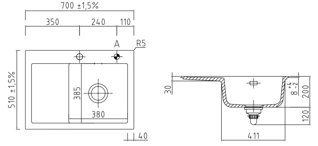 - uwaga: zalecamy, ze względu na tolerancję wymiarów (+/- 1,5%), wycinanie otworu w blacie przy użyciu dostarczonej sztuki zlewozmywaka. Fabrycznie zlewozmywak ma wycięty otwór pod baterię, istnieje możliwość wycięcia dodatkowego otworu na życzenie Klienta.