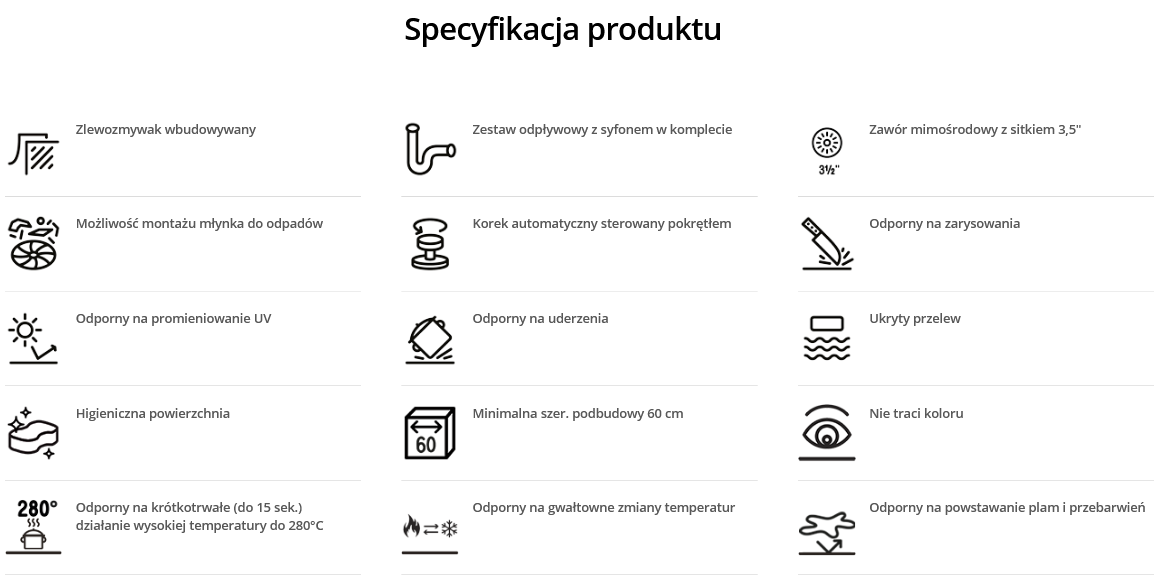 ODPORNE NA UDERZENIA - Materiał jest odporny na działanie wszystkich niekorzystnych czynników, które na co dzień występują w kuchni. Testy wykazały, że zlewozmywak bez najmniejszego uszczerbku znosi upadki drobnych przedmiotów kuchennych.