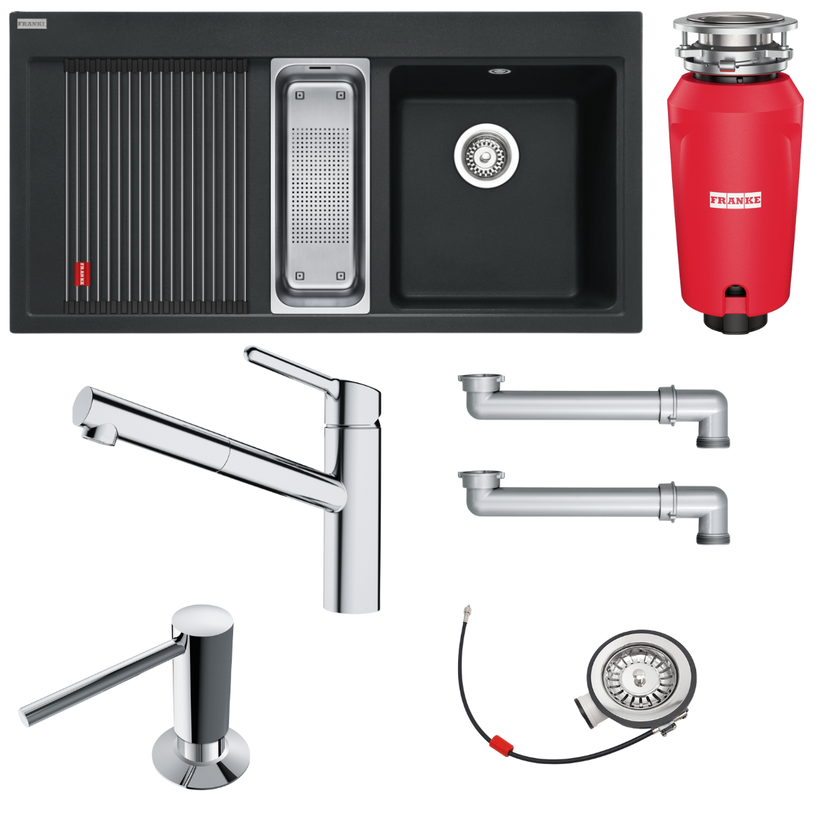 W ZESTAWIE ZNAJDUJE SIĘ SYFON WRAZ Z ODPŁYWAMI, KOREK AUTOMATYCZNY ORAZ PRZEDŁUŻKA UNIWERSALNA FRANKE